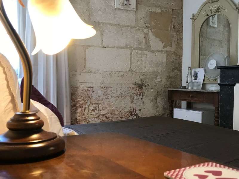 Les + : Chambre romantique, pierres apparentes et cheminée décorative.